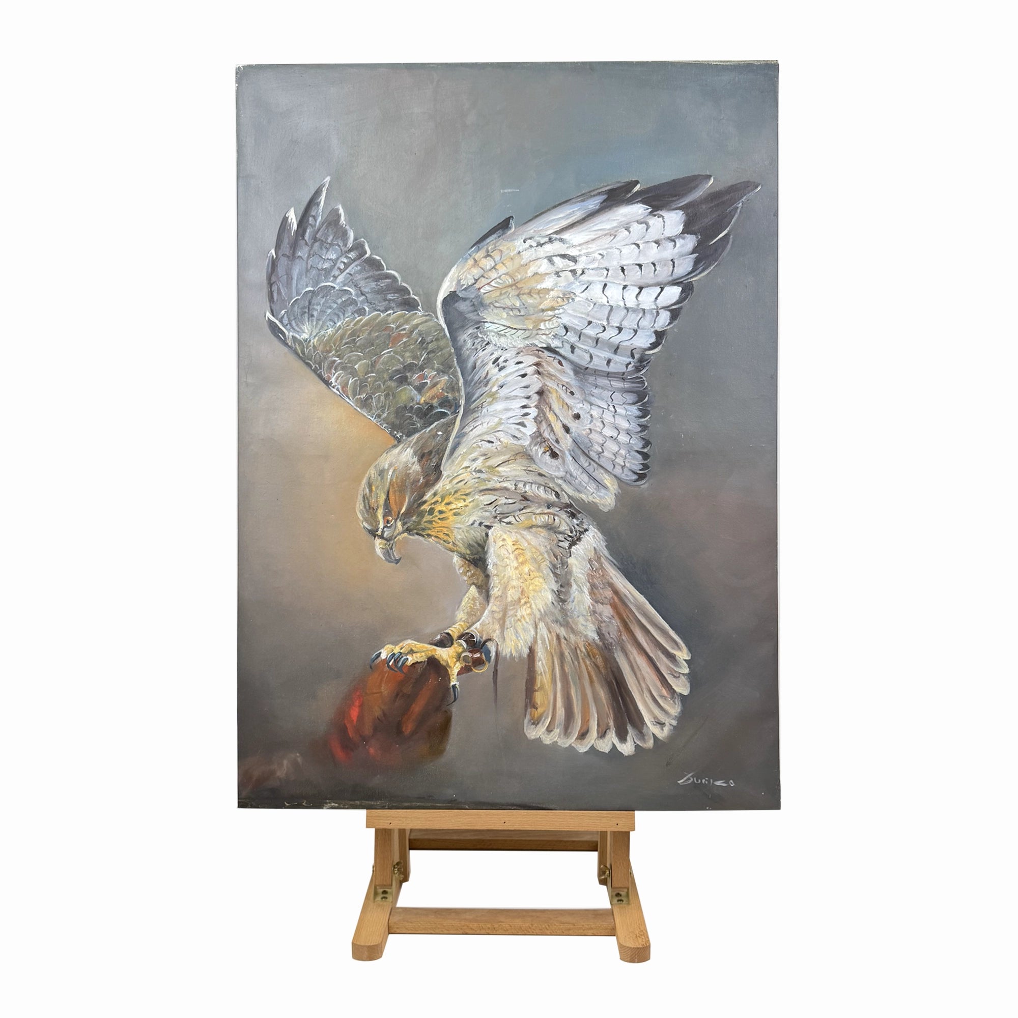 A 60x85 cm oil painting capturing a hawk’s focused descent, claws ready and wings wide